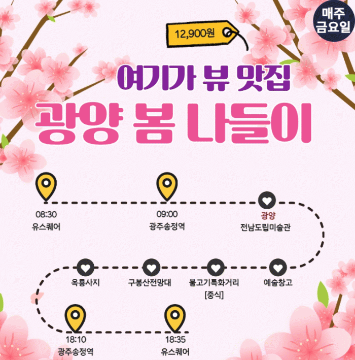 이어 서천변 광양불고기특화거리에서 점심을 즐긴 후, 구봉산전망대, 옥룡사동백나무숲 등에서 광양의 찬란한 봄날을 만끽하고 유스퀘어(18시 35분)에 도착하는 코스다.