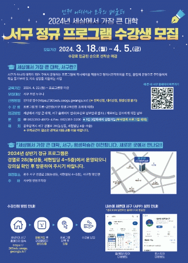 운영 프로그램은 ▲시민참여학과 10개 과정(우리마을생태해설사 양성과정 등) ▲인문사회학과 7개 과정(카프카로 읽는 가족 인문학, 서양철학에서 배우는 삶의 지혜 등) ▲문화예술학과 9개 과정(시니어모델, 내 손으로 만드는 숏 단편영화 등) ▲주민건강학과 1개 과정(걷기지도자 양성과정) ▲전남대커뮤니티학과 3개 과정(호남의 서정을 일구어낸 시인들 등) 총 5개 학과 30개 강좌이며, 4월 22일부터 새로 이전하는 서구평생학습관(경열로 28, 농성동 세현빌딩 4층~5층)에서 진행된다.