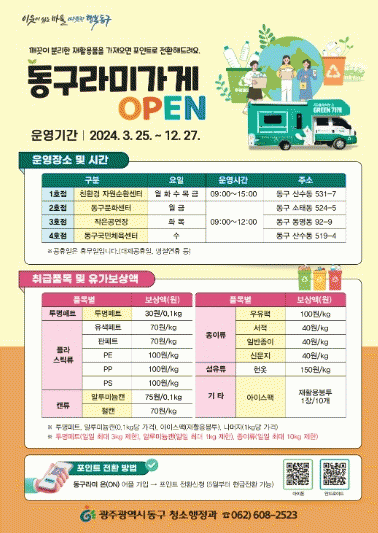 임택 동구청장은 “많은 주민들이 ‘동구라미 가게’를 방문해 환경보호에 직접적으로 참여하는 기쁨과 현금 보상의 혜택까지 일석이조의 효과를 누리시길 바란다”면서 “앞으로도 지구를 살리는 지속 가능한 자원 순환 도시 동구 조성을 위해 최선을 다하겠다”고 말했다.