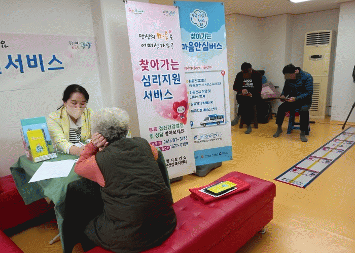 찾아가는 심리지원 서비스는 정신건강 전문 상담 인력이 거동이 불편한 노인과 장애인 시설, 취약 지구 아파트 단지 등을 방문해 ▲개별상담 ▲스트레스 측정 ▲정신건강 선별검진 ▲정신건강 정보제공 ▲자살예방 인식개선 홍보 등의 상담 서비스를 제공하고 있다.