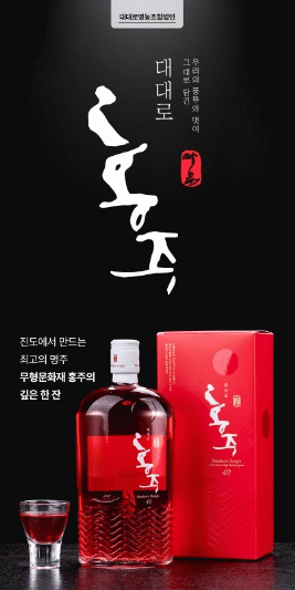 대대로홍주40도는 알코올 도수 40도로 100% 진도산 쌀과 지초를 넣어 빚은 순곡주로 주종은 리큐르다.