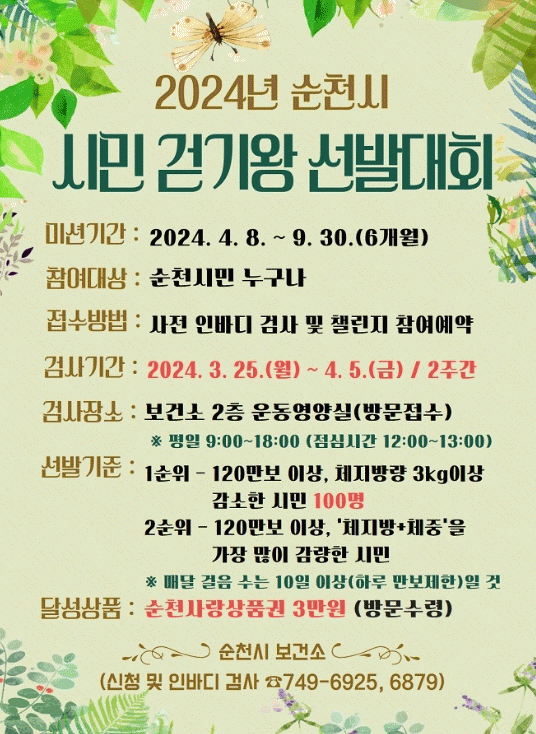 선정방법은 1일 만보 제한으로 매월 10일 이상 걸어야 하며 6개월 동안 120만 보 이상을 걷기 실천을 하며 근육량은 늘리고 체지방량 3kg이상 감소시킨 시민을 우선 선정할 계획이다.