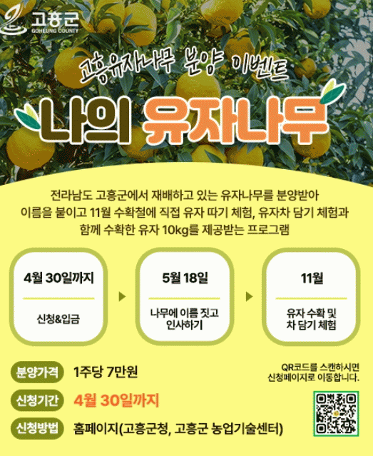 ‘나의 유자나무’ 분양 이벤트는 고흥군에서 재배하고 있는 유자나무를 분양받아 유자꽃이 피는 시기에 자신만의 특별한 이름을 유자나무에 붙이고 11월 유자 수확시기에 직접 유자를 수확해 차로 담을 수 있는 체험 기회와 수확한 유자 중 일부(1주당 유자 수확량 10㎏ 보장)를 제공하는 도농 공감형 특별 프로그램이다.