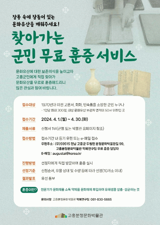 ‘무료 훈증’은 고흥지역 내 개인이나 단체 등이 소장하고 있는 문화유산을 대상으로 직접 찾아가 훈증소독을 해주는 사업이다.