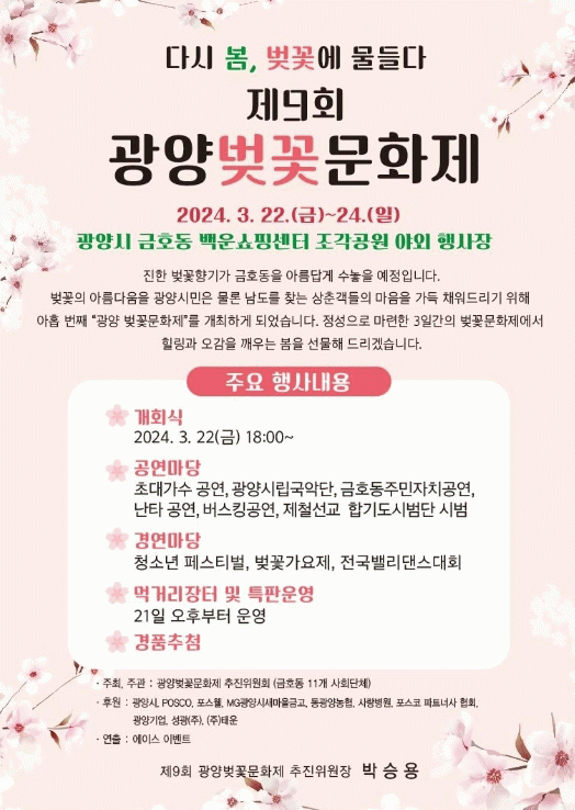 올해 제9회를 맞는 ‘광양벚꽃문화제’는 오는 22일부터 24일까지 사흘간 금호동 백운쇼핑센터 조각공원 일원에서 ‘다시 봄, 벚꽃에 물들다’를 슬로건으로 개최된다.