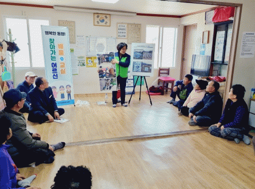 지난 13일 오월경로당에서 시작한 첫 수업 주제는 ‘환경’이었다. 영농폐기물, 생활쓰레기의 올바른 배출 방법과 폐의약품 처리법 교육에 이어 ‘재활용품 수거 인센티브 제도’ 소개 등이 이어졌다.