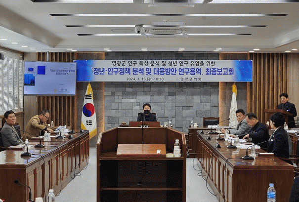 의원정책연구 1팀 대표 장기소 의원은 “인구대응 선도도시인 영광군은 5년 연속 합계출산율 1위를 달성했지만 그 수치는 매년 감소하고 있는 상황으로 이를 극복하기 위해서는 효과적인 대책이 필요하다.”며, 연구용역을 통해 “지역소멸을 막기 위해서는 외부 인구 유입과 출산 인구 증가가 필요하고, 특히 청년들이 정착할 수 있도록 양질의 일자리와 살기 좋은 정주여건 등을 제공함으로써 젊고 활기찬 영광을 구현해야 한다.”라고 밝혔다.