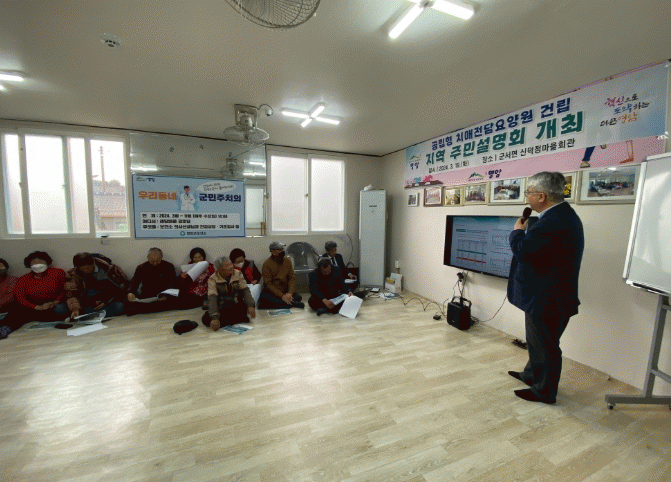 이날 주민설명회에서 치매전담요양원 타당성 연구용역을 맡은 박세희 유)승우건설 본부장은, 요양원 건립지 주민에게 △치매노인 및 요양기관 현황 △사업대상지 입지 여건 분석 △경제성 검토 등을 설명했다.