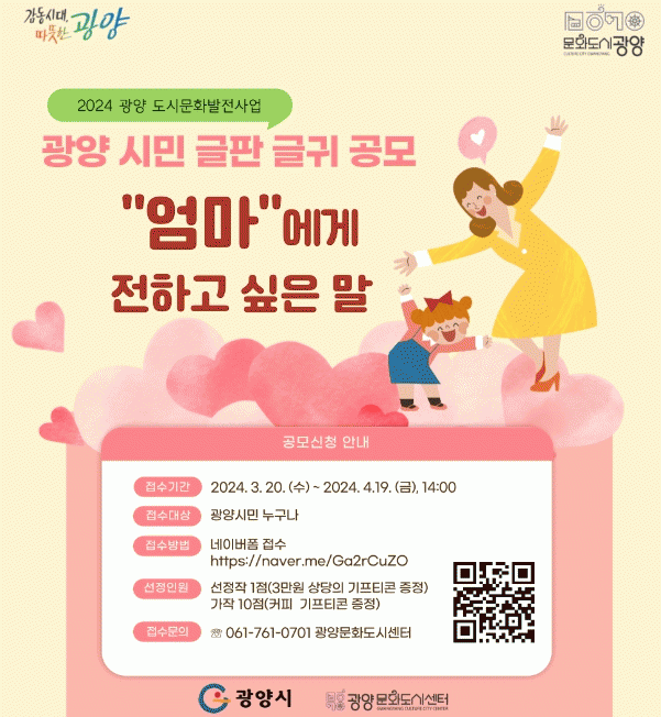 이번 글귀 공모는 ‘엄마에게 전하고 싶은 말’을 주제로 진행되며, 광양시를 생활권으로 둔 시민이라면 누구나 참여할 수 있다.