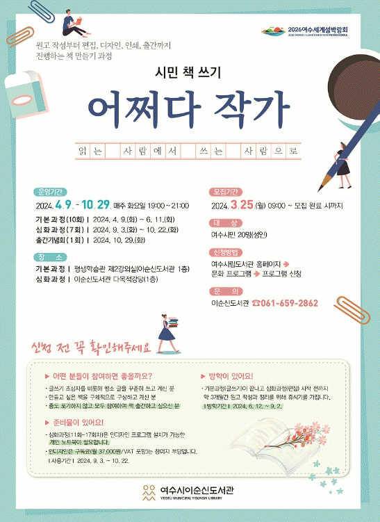 모집 대상은 글쓰기 초심자를 비롯해 평소 글을 꾸준히 쓰고 있는 참여희망자, 만들고 싶은 책을 구체적으로 구상하고 있는 책 출간희망자로 중도 포기하지 않고 모든 회차에 참여할 수 있는 여수시민이다.