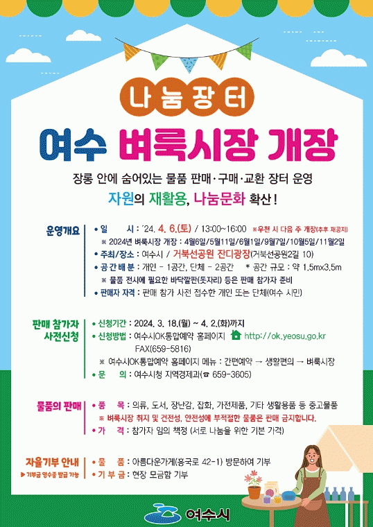 조용연 지역경제과장은 “2013년부터 10년 넘게 나눔문화 확산과 이웃 간 소통의 장으로 꾸준히 사랑받아 온 여수 벼룩시장의 성공적인 첫 개장을 위해 많은 시민들의 관심과 참여를 바란다”라고 말했다.