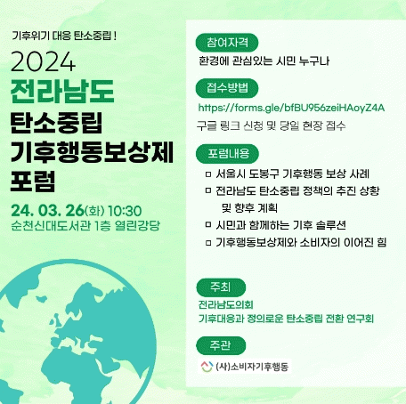 도의회 주종섭 의원이 좌장을 맡은 이번 포럼은 ‘전남지역의 기후위기 대응과 탄소중립 실현을 위한 기후행동보상제 고찰’을 주제로 소비자기후행동 김미숙 전남대표, 전라남도 이범우 기후대기과장, 순천시의회 이복남 의원, 서울시 도봉구 이종형 기후환경과장이 참석해 주제발표와 종합토론을 할 예정이다.