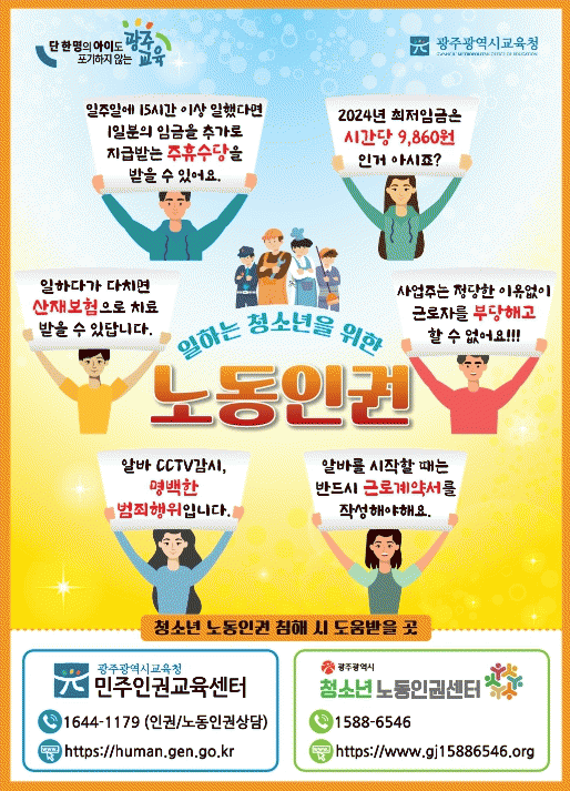 포스터 내용은 일하는 청소년이 알아야 할 학생 노동인권 꿀팁을 중심으로 구성됐다. ▲주휴수당 ▲최저시급 ▲산재보험 ▲부당해고 ▲전자감시 ▲근로계약서 ▲노동인권 침해 센터 연락처 등 정보를 한눈에 볼 수 있도록 했다.