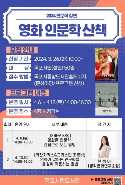 강연 참가 신청은 오는 26일 오전 10시부터 목포시통합도서관 누리집에서 가능하며, 자세한 내용 문의는 목포시립도서관으로 하면 된다.