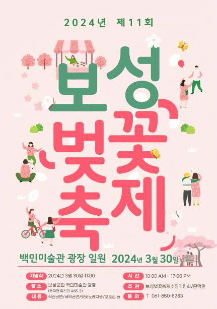 보성벚꽃축제추진위원회 조연옥 위원장은“보성벚꽃축제를 찾아주시는 분들이 따뜻한 봄날의 정취를 느낄 수 있도록 행사 준비에 박차를 가하겠다.”라며 “보성 왕벚나무 터널에서 2024년의 봄을 추억할 인생 벚꽃 사진을 남겨가시길 바란다.”라고 말했다.