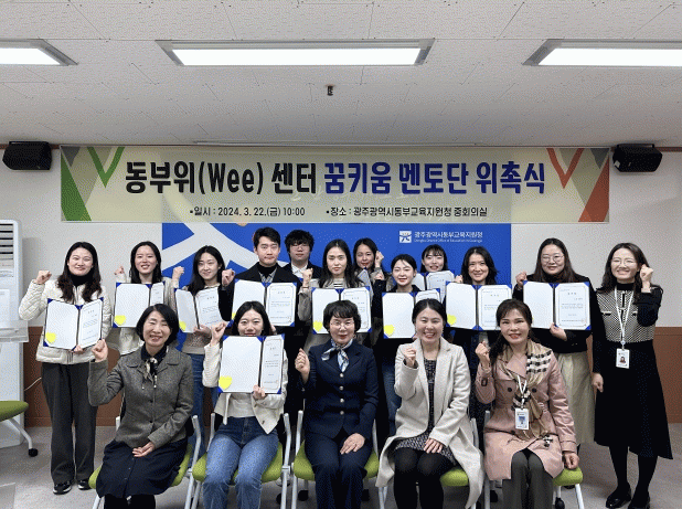 이번 위촉식은 전남대학교 교육학과 정주리 교수와 앞으로 멘토를 맡을 14명이 참여한 가운데 이뤄졌다. 멘토단 14명은 동부위(Wee) 센터와 MOU 협약을 맺은 전남대(심리학과, 교육학과)·호남대(상담심리학과) 대학원생들로 구성됐다. 앞으로 전공교수(전남대학교 강영신 교수, 정주리 교수, 호남대학교 임수진 교수)의 지도를 받아 올해 멘토링 프로그램을 진행할 예정이다.