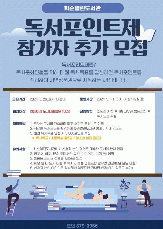 사업 참여를 희망하는 주민은 3월 26일(화)부터 화순열린도서관 회원증을 지참하고 군민종합문화센터(1층 사무실)에 방문·신청하면, 독서 노트를 즉석에서 제공받을 수 있다.