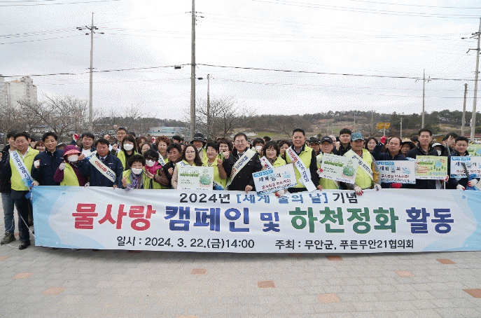 이번 행사에는 푸른무안21협의회 회원과 공무원 등 170여 명이 동참하여 물의 소중함을 되새겨 보는 물사랑 캠페인과 깨끗한 무안천 환경조성을 위해 약 5km 구간에 걸쳐 하천 주변의 각종 생활 쓰레기와 폐기물을 수거하며 정화 활동을 했다.