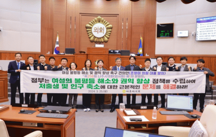 나주시의회는 건의안을 통해 ▲정부는 여성의 불평등 해소와 권익 향상을 위한 정책을 수립하여 저출생 및 인구축소에 대한 근본적인 문제를 해결할 것 ▲성평등 실현을 위한 실질적인 대책을 마련할 것을 제안했다.