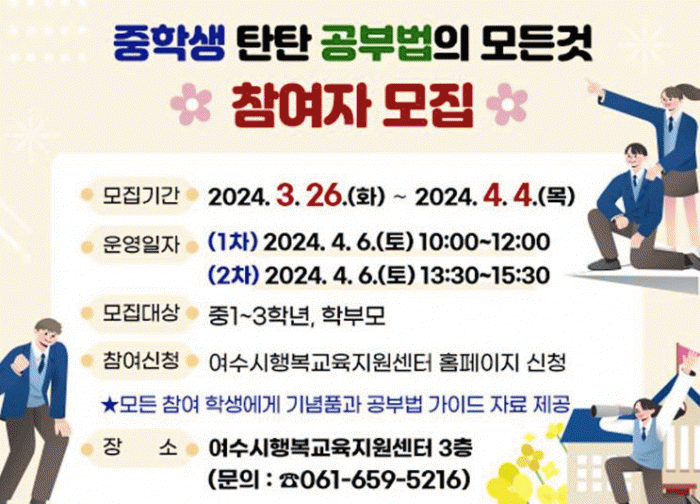 김종원 평생교육과장은 “수업 준비부터 시험 볼 때까지 성적에 대해 고민 있는 중학생들이 자신의 공부 방법을 재평가하고 개선하는 시간이 될 것”이라며 “특강에서 제공되는 현실적 공부법이 좋은 공부 습관 형성과 학교 성적 향상에 도움이 되길 바란다”고 말했다.