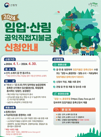 한편, 군 관계자는“임업직불금 신청기간이 지난해보다 빨라지고, 변경 사항이 있는 만큼 신청기간 및 구비서류 등을 잘 확인하여 자격조건이 충족되는 많은 임업인이 혜택을 누릴 수 있길 바란다.”라고 밝혔다.