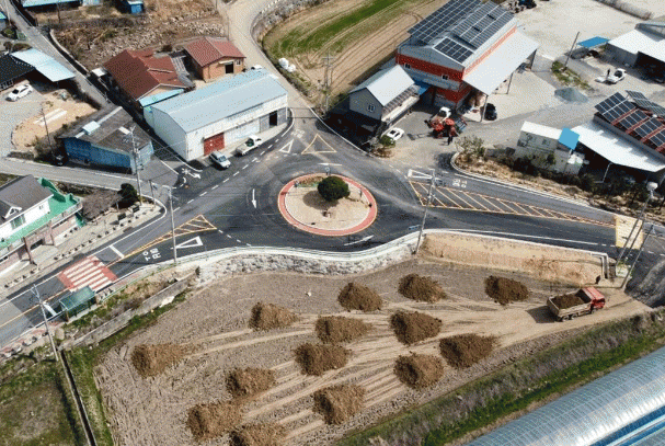군도10호선과 마을안길이 교차하는 오거리에 지역주민들의 교통안전을 확보하기 위해 회전교차로를 설치했다.