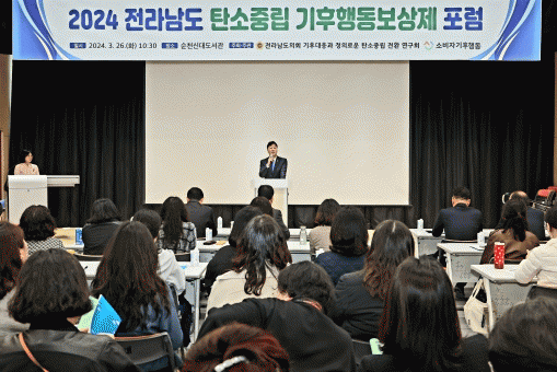 이번 포럼은 ‘기후위기 대응과 탄소중립 실현을 위한 기후행동보상제 고찰’을 주제로 전남도의회 기후대응과 정의로운 탄소중립 전환연구회 주최, (사)소비자기후행동 주관으로 개최됐으며 관계 기관과 공무원, 시민 등 130여 명이 참석했다.