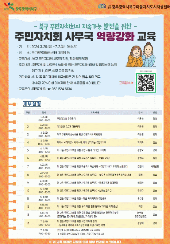 참여를 희망하는 교육 대상은 홍보 웹자보에 있는 QR코드를 통해 네이버폼을 작성.제출하면 되고 기타 자세한 사항은 북구마을자치도시재생센터에 전화 문의하면 된다.