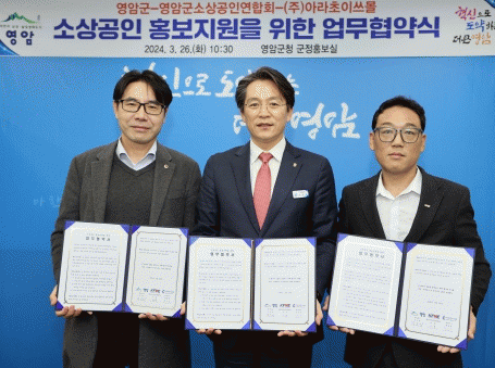 영암군이 26일 군청에서 영암군소상공인연합회, ㈜주아라초이쓰몰과 소상공인 홍보 지원 업무협약을 체결했다.