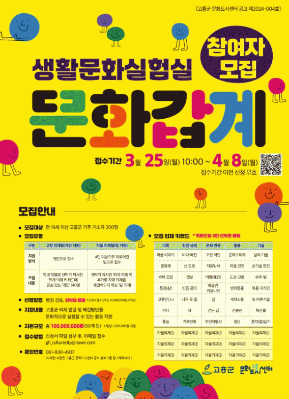 문화갑계 사업은 만 19세 이상 고흥군 거주·거소자이면 누구나 참여할 수 있으며, 모집유형은 고정 의제형과 자율 의제형 2개 분야 200명을 모집한다.