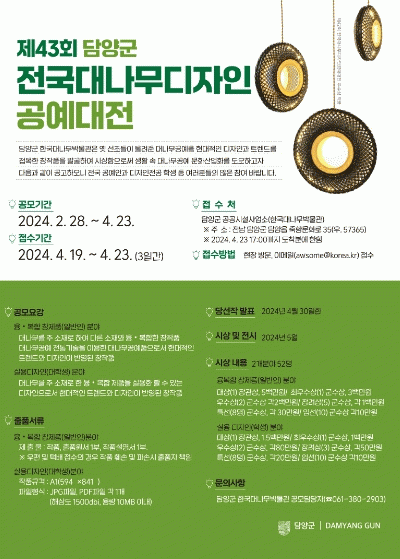 군 관계자는 “뛰어난 대나무공예 창작품을 발굴하고 전국 공예인들의 창작 의욕을 고취하기 위해 추진하는 대회인 만큼 많은 관심과 참여를 바란다”라고 말했다.