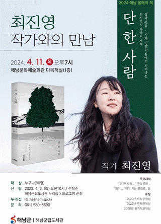 군 관계자는“이번 작가와의 만남을 통해 '단 한 사람' 이 담고 있는 삶과 죽음, 신과 인간의 틈에서 피어나는 최진영식 사랑의 세계와 작가 특유의 섬세한 문체와 감성을 생각할 수 있는 자리가 되리라 기대한다”고 말했다.