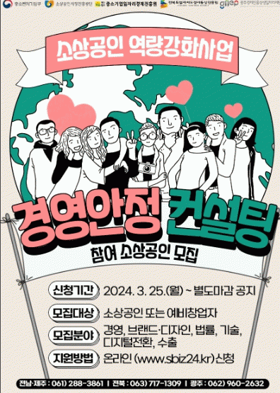 신청은 소상공인24에서 온라인 신청(지원사업신청→공고조회→[광주호남권역])만 가능하다. 온라인 신청은 ①[광주호남권역] 2024년 소상공인 역량강화 '경영안정 컨설팅' 참여 소상공인 상반기 모집 공고 하단에 ‘지원신청’ ②수집·이용 및 제공 동의 ③마이데이터 정보제공 동의 ④자가 진단 ⑤신청정보작성 순으로 진행되며 신청 마감일은 5월 1일까지이다.