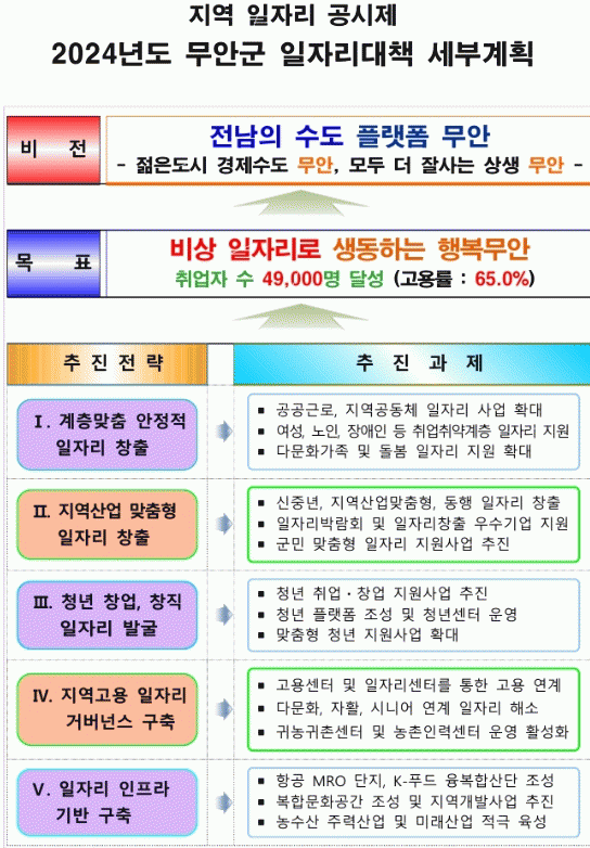 한편, 이번에 공시된‘지역 일자리 공시제 2024년도 일자리대책 연차별 세부계획’은 무안군 홈페이지 내 고시·공고 및 지역고용정보네트워크홈페이지 내 공시현황에서 확인할 수 있다.