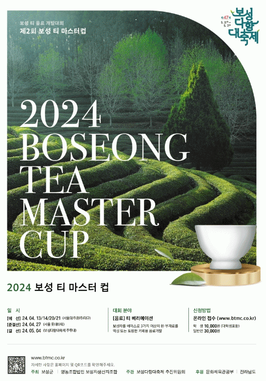 ‘보성 티 마스터컵’은 3월 15일부터 4월 8일까지 접수해 오는 ▲4월 13일 서울, ▲4월 14일 광주, ▲4월 20일 원주, ▲4월 21일 대구 예선을 거쳐 4월 27일 서울 롯데타워에서 준결선을 개최하고, 5월 4일 제47회 보성다향대축제 주무대에서 본선을 치른다.
