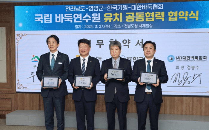 이날 협약식은 국립 바둑연수원 건립 국가 정책사업 확정, 바둑연수원 영암군 성공 유치 등을 위해 협력 체계를 구축하는 자리.