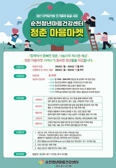 모집 대상은 전라남도 및 순천시에 주소지를 둔 19세 이상 40세 이하 청년으로 정신건강의학과에서 5년 이내 치료 중이거나 정신건강 서비스가 필요하면 소득 제한 없이 신청 가능하다.