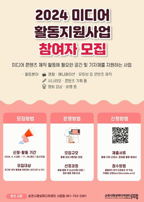 사업 신청은 순천시영상미디어센터 홈페이지에서 가능하며, 궁금한 사항은 전화로 문의하면 된다.