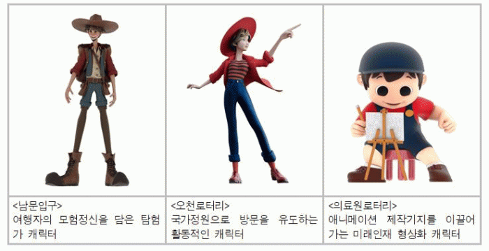 또한, 의료원로터리에 설치한 캐릭터는 애니메이션 제작기지를 이끌어가는 미래인재를 형상화한 것으로 원도심의 창의적인 잠재력과 미래 성장 가능성을 상징한다.