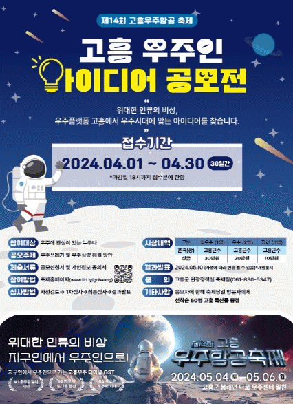 우주에 관심이 있는 누구나 참여할 수 있으며, 아이디어 제안서와 청렴 동의서를 작성해 오는 4월 1일부터 30일까지 축제 홈페이지를 통해 접수하면 된다.