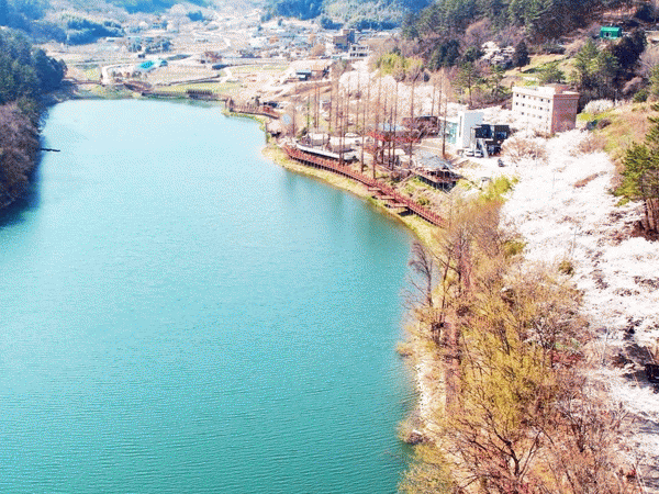 한수제 물레길에선 사계절 아름다운 풍광을 자랑하는 호수 위를 걷고 봄철 만개한 벚꽃을 감상할 수 있다.