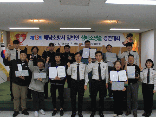 해남소방서 일반인 심폐소생술 경연 대회 최우수상은 해남교도소(교사일생팀), 우수상은 장애인종합복지관(심장아 나대줘팀), 장려상은 한마음 재가복지센터(알콩달콩 한마음팀)이 받았다.