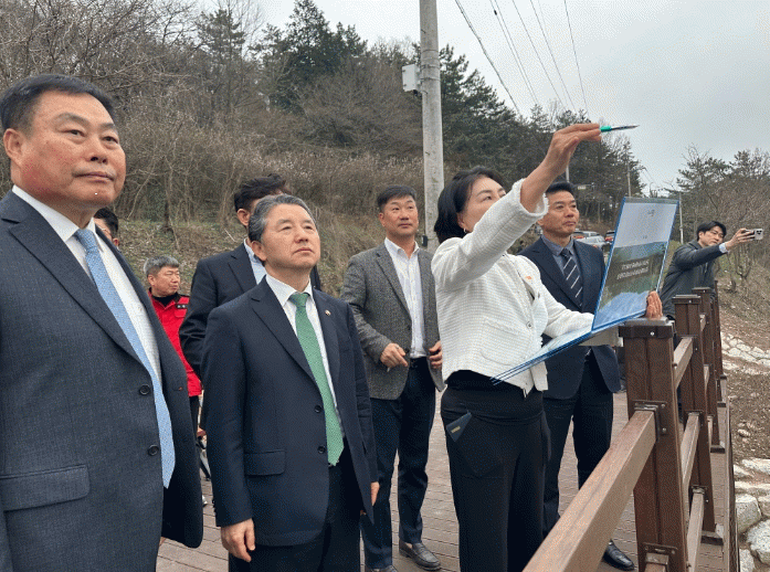 현장을 안내한 김산 군수는 2025년 국고 건의 사업으로 총 540억 원 규모의 3개 산업(기후대응 도시 숲, 친환경 목조 오션타워, 공립산림레포츠센터)을 건의했고, 직접 사업 계획을 브리핑하는 등 열의를 보여 산림청의 긍정적인 반응을 얻었다.