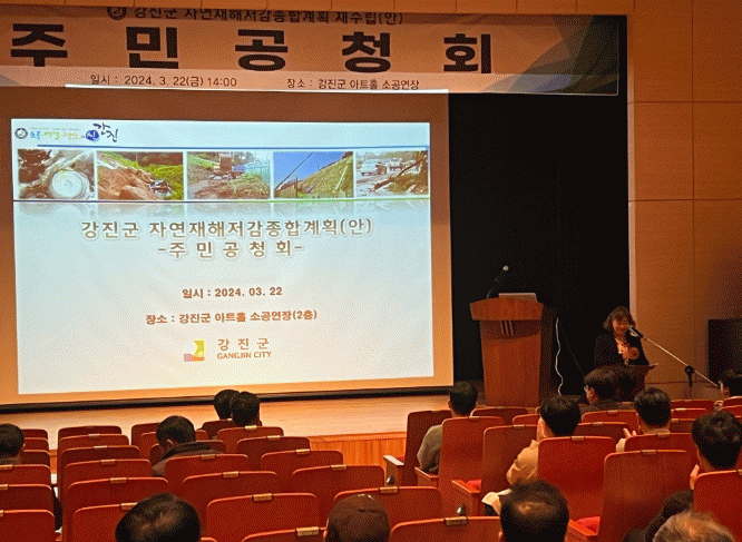 이번 공청회는 강진군 전역 500.96㎢에 대해 자연재해 위험 요인을 종합적으로 조사 분석해 선정한 위험지구 94개소에 대한 종합적인 설명과 그 외 추가 지구 선정을 위한 전문가 의견과 지역주민의 의견을 청취하기 위해 마련됐다.