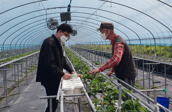 유전적으로 깨끗한 묘를 해마다 만들어 육묘농가에 보급하는 사업으로 올해도 기술센터 내 유리온실에 딸기 원원묘 500주를 정식했다.
