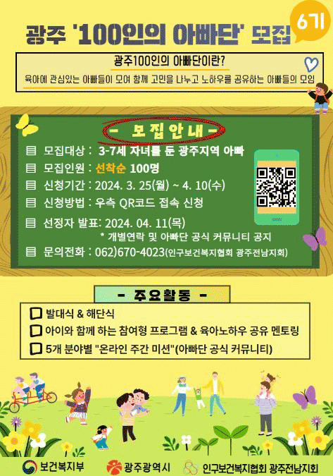 대상은 광주에 거주하는 3부터 7세 자녀를 양육하는 아빠이며, 선정자는 4월 11일 개별 통보 및 온라인 커뮤니티를 통해 발표한다.