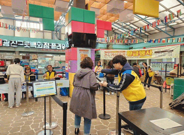 무등시장에서 구매한 농?축?수산물 금액 기준으로 3만4,000원과 6만7,000원 이상 구입한 소비자에게 각각 온누리 상품권 1만원과 2만원을 환급하고 있다.