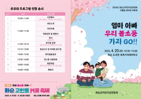 행사관계자는 “코로나19 때는 화순군 어린이들이 한자리에 모일 수가 없었는데 새봄을 맞아 따스한 햇살과 함께 풍요롭고 행복한 한때를 만끽할 수 있도록 준비했다. 많이들 오셔서 축제를 즐겨주시길 바라고 기대하셔도 좋다”라는 자신감을 밝혔다.