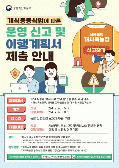이화엽 농업기술센터 소장은 “특별법이 제정된 만큼 대상자들은 해당 기간 내 운영신고서와 개 식용 종식 이행계획서를 반드시 제출해 불이익을 받는 일이 없도록 주의해 달라”면서 “개 식용 업계의 전·폐업이 원활하게 진행될 수 있도록 관심과 협조를 당부드린다”고 말했다.