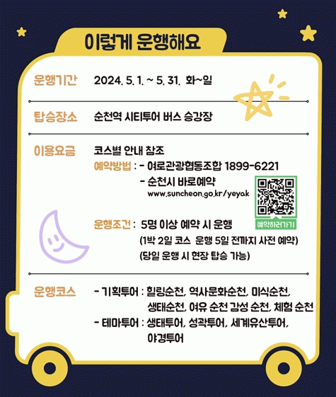 한편, 5월 4~6일 어린이날 연휴에는 휴무 없이 운행한다. 순천시티투어 이용요금, 운행코스 등 상세 내용 확인과 온라인 예약은 순천시 바로예약에서 가능하다.